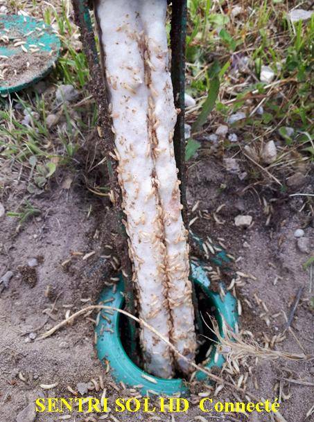 Le traitement par pièges Sentri-tech est une méthode innovante et écologique pour lutter contre les termites. Il consiste à installer les pièges Sentri-Tech contenant la formulation insecticide solide (et non pâteuse). La molécule hexaflumuron contenue dans la formulation insecticide solide va être véhiculée par les termites ouvriers au sein de la termitière. Les termites ouvriers sont les seuls nourriciers de la colonie. Ils vont muer pour se développer une dizaine de fois dans leur vie (estimée entre deux ans et deux ans et demi). Les termites ouvriers prospectent en permanence pour trouver la nourriture. Quand ils trouvent un ou plusieurs pièges Sentri-Tech installés sur le périmètre de la zone à protéger, ils vont consommer la formulation insecticide. Les termites ouvriers qui sont restés dans la termitière suivent la piste marquée par des phéromones. Les termites installés dans les pièges Sentri-Tech transmettent à leurs congénères l’hexaflumuron par trophallaxie (bouche à bouche), qu’ils véhiculent au sein de la termitière. Tous les termites qui sont au stade de la mue ne peuvent pas muer. Ils meurent et quand il n’y a plus de termites ouvriers dans la termitière, cette dernière meurt de faim et est éradiquée.